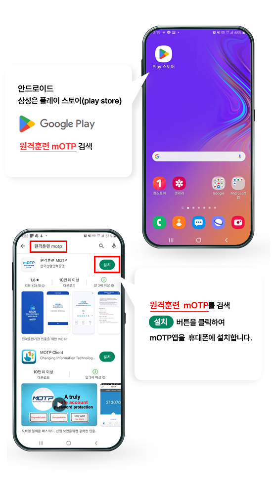 STEP 01 사용하는 휴대폰(스마트기기한정)에 따라 삼성은 플레이 스토어(play store), 애플은 앱스토어(App store)에서